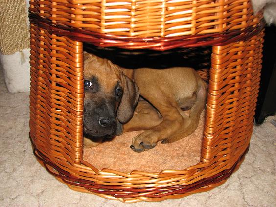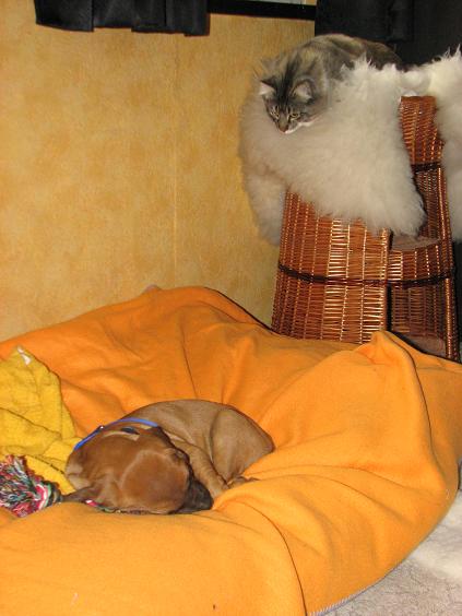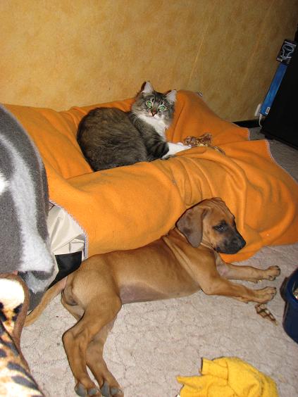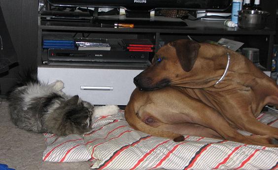 Nun liegen der Löwenjäger (Rhodesian Ridgeback) Abuya und Norweger Kater Viljo zusammen da.